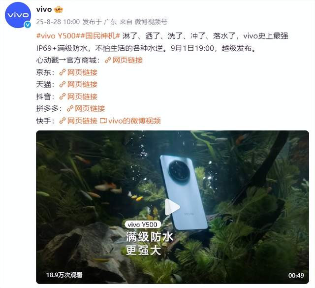 vivo深耕手机市场这么多年,很清楚大多数用户想要的需要的是什么,“经久耐用”属于是基础需求。而这个方面vivo向来是做得很棒的,特别是在vivo Y500上更是有着越级提升,将IP69+/IP69/IP68满级防水给安排上了,成为了vivo史上最强IP69+满级防水手机。按照官方预热视频的内容所说,这款新机将可以做到无惧各种水逆场景的挑战,无论是下雨淋水、手机掉鱼缸还是手机掉进了洗衣机中,都不会被泡坏淋坏,拿出来就能正常使用。